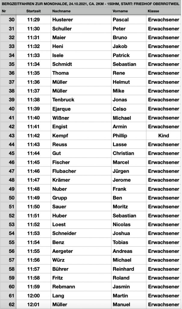 Startliste Bergzeitfahren zur Mondhalde am 24.10.2021 Posted on 23. Oktober 202123. Oktober 2021 by Jakob Heni Posted in Allgemein
